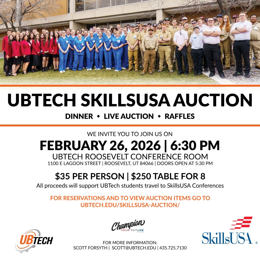 Help support UBTech SkillsUSA Competitors by attending the UBTech SkillsUSA Auction. There will be dinner, a live auction, and a raffle. The cost to attend is $35 per person, $250 for a table of eight. All proceeds will support UBTech students’ travel to SkillsUSA Conferences. Doors open at 5:30 PM. For more information, contact scott@ubtech.edu or phone 435-725-7130